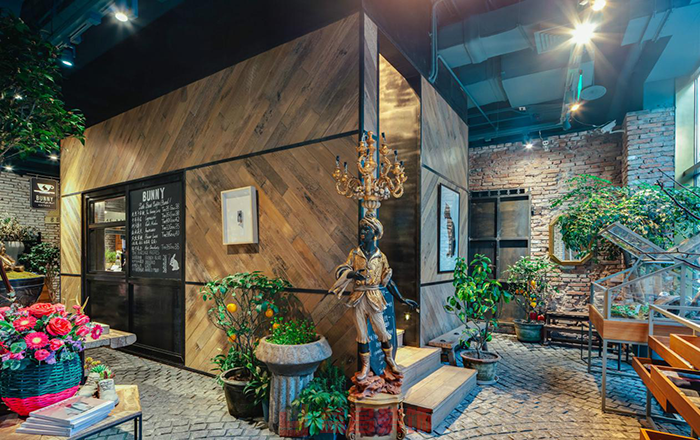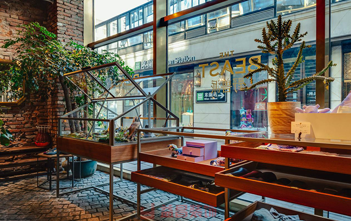 這家店鋪是結合電影《美女與野獸》中的元素,呈現了一種寧靜、優雅、神秘的氣息。整個店鋪的風格融入了電影《美女與野獸》的元素。首先映入眼簾的是滿眼的綠色和木色,仿佛走入鳥語花香的大自然一般。滿地的文化磚,仿佛進入了電影中女主人公貝兒居住的寧靜的小村莊。